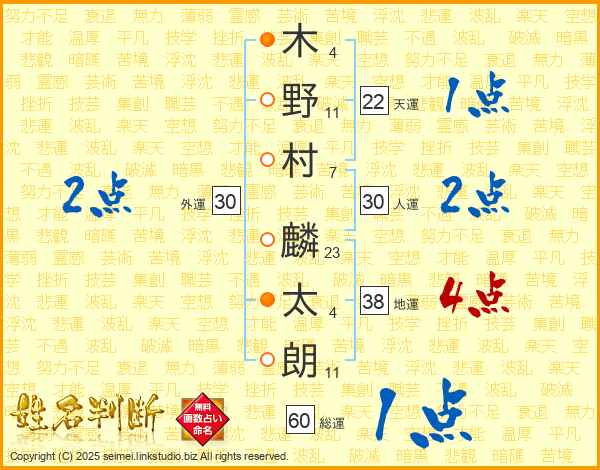 木(4画)野(11画)村(7画) 麟(23画)太(4画)朗(11画)