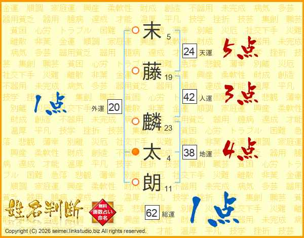 末(5画)藤(19画) 麟(23画)太(4画)朗(11画)