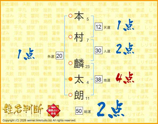 本(5画)村(7画) 麟(23画)太(4画)朗(11画)
