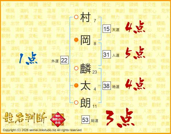 村(7画)岡(8画) 麟(23画)太(4画)朗(11画)