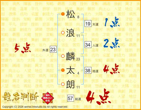 松(8画)浪(11画) 麟(23画)太(4画)朗(11画)