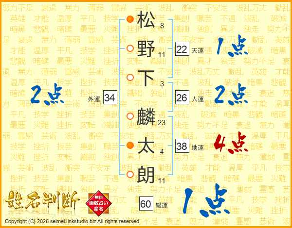 松(8画)野(11画)下(3画) 麟(23画)太(4画)朗(11画)