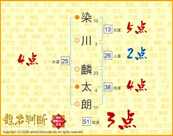 染(10画)川(3画) 麟(23画)太(4画)朗(11画)