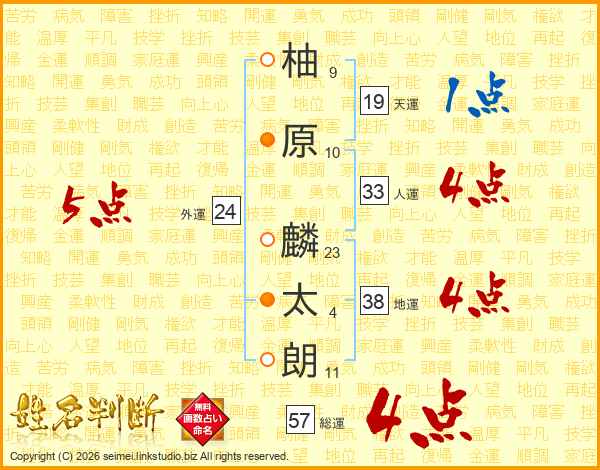 柚(9画)原(10画) 麟(23画)太(4画)朗(11画)