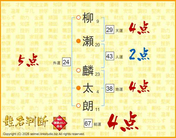 柳(9画)瀬(20画) 麟(23画)太(4画)朗(11画)