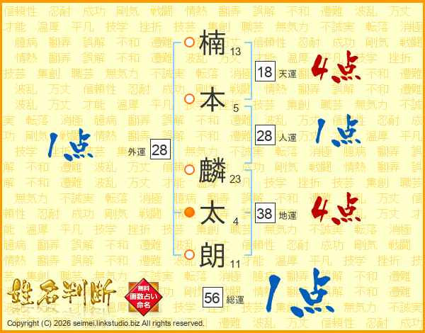 楠(13画)本(5画) 麟(23画)太(4画)朗(11画)