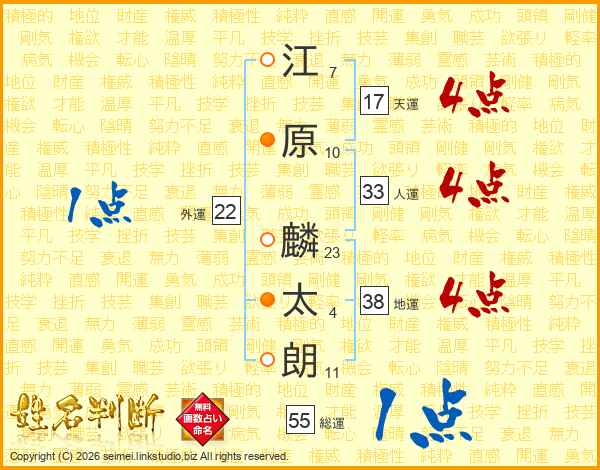 江(7画)原(10画) 麟(23画)太(4画)朗(11画)