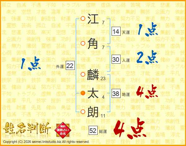 江(7画)角(7画) 麟(23画)太(4画)朗(11画)
