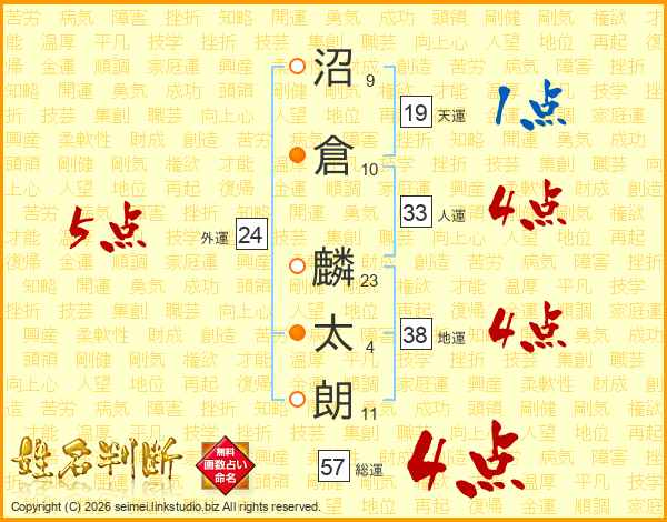 沼(9画)倉(10画) 麟(23画)太(4画)朗(11画)