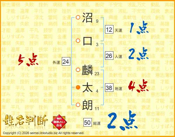 沼(9画)口(3画) 麟(23画)太(4画)朗(11画)