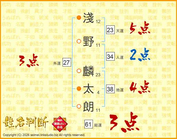 淺(12画)野(11画) 麟(23画)太(4画)朗(11画)