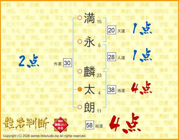 満(15画)永(5画) 麟(23画)太(4画)朗(11画)
