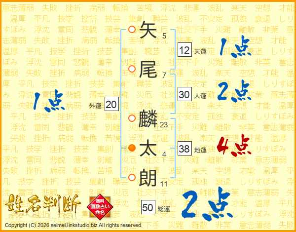 矢(5画)尾(7画) 麟(23画)太(4画)朗(11画)