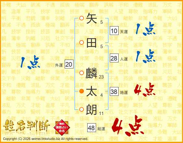 矢(5画)田(5画) 麟(23画)太(4画)朗(11画)