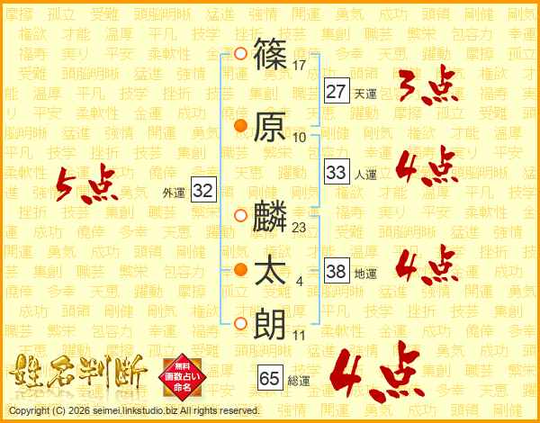 篠(17画)原(10画) 麟(23画)太(4画)朗(11画)