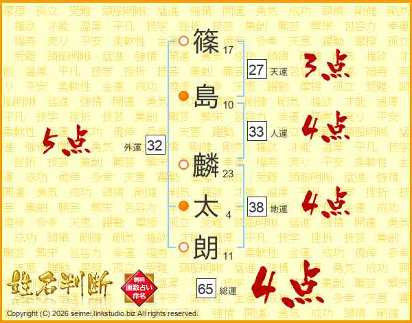 篠(17画)島(10画) 麟(23画)太(4画)朗(11画)