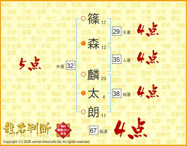篠(17画)森(12画) 麟(23画)太(4画)朗(11画)