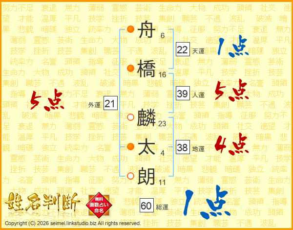 舟(6画)橋(16画) 麟(23画)太(4画)朗(11画)