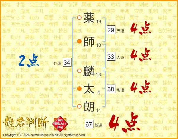薬(19画)師(10画) 麟(23画)太(4画)朗(11画)