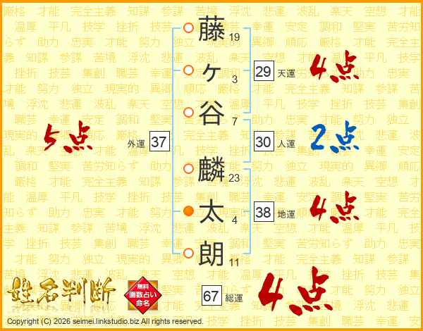 藤ヶ谷麟太朗さんの総運は67画の4点!