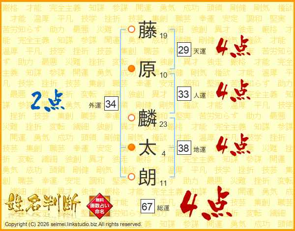 藤(19画)原(10画) 麟(23画)太(4画)朗(11画)