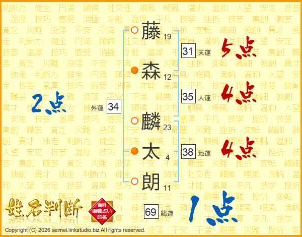 藤(19画)森(12画) 麟(23画)太(4画)朗(11画)