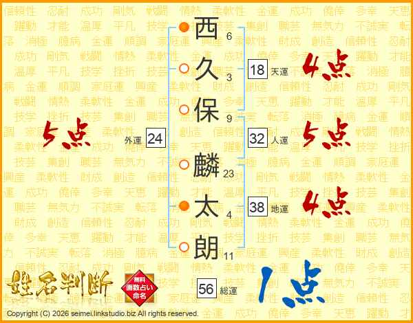 西(6画)久(3画)保(9画) 麟(23画)太(4画)朗(11画)