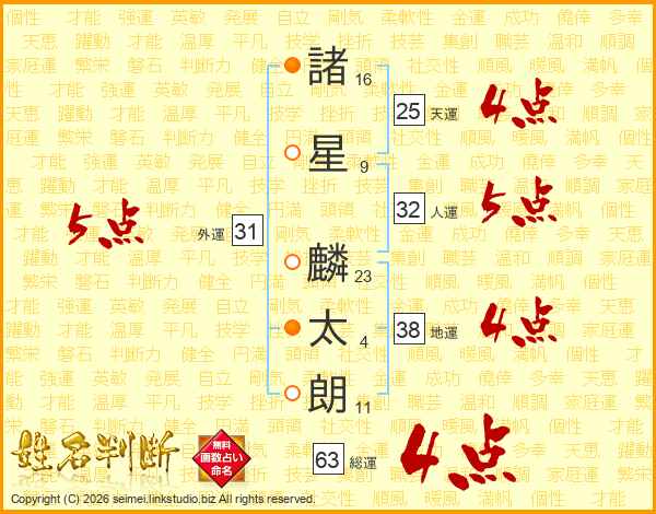 諸(16画)星(9画) 麟(23画)太(4画)朗(11画)