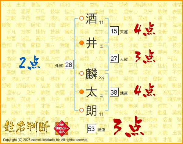 酒(11画)井(4画) 麟(23画)太(4画)朗(11画)