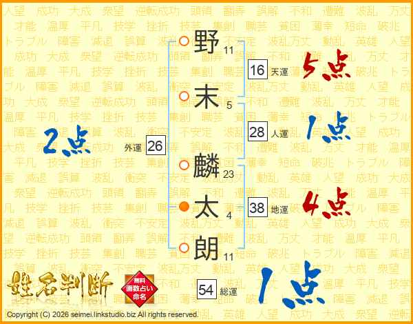 野(11画)末(5画) 麟(23画)太(4画)朗(11画)