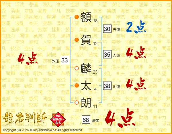 額(18画)賀(12画) 麟(23画)太(4画)朗(11画)