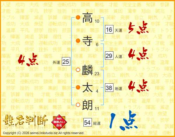高(10画)寺(6画) 麟(23画)太(4画)朗(11画)