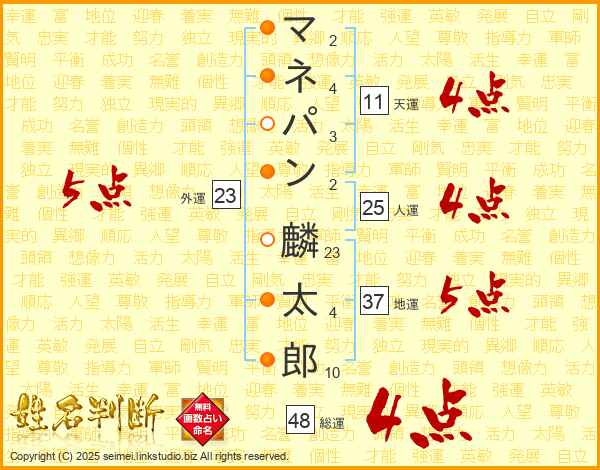マ(2画)ネ(4画)パ(3画)ン(2画) 麟(23画)太(4画)郎(10画)