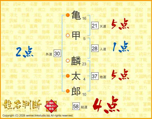 亀(16画)甲(5画) 麟(23画)太(4画)郎(10画)