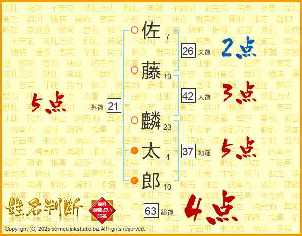 佐(7画)藤(19画) 麟(23画)太(4画)郎(10画)