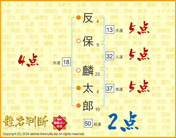 反保麟太郎さんの天運は13画の5点!