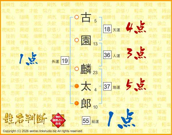 古(5画)園(13画) 麟(23画)太(4画)郎(10画)