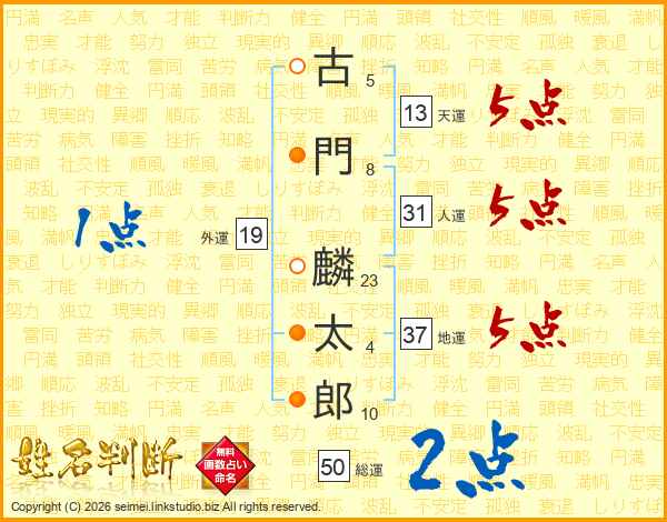 古(5画)門(8画) 麟(23画)太(4画)郎(10画)