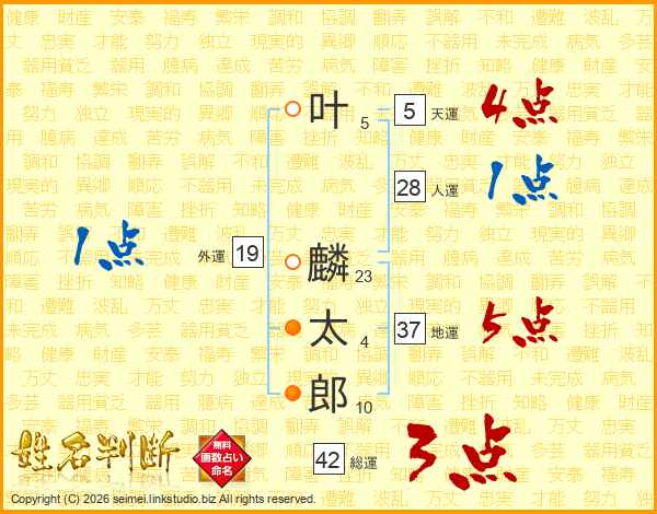 叶(5画) 麟(23画)太(4画)郎(10画)
