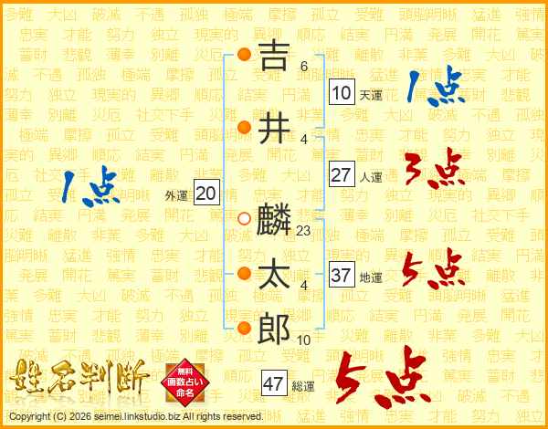 吉(6画)井(4画) 麟(23画)太(4画)郎(10画)