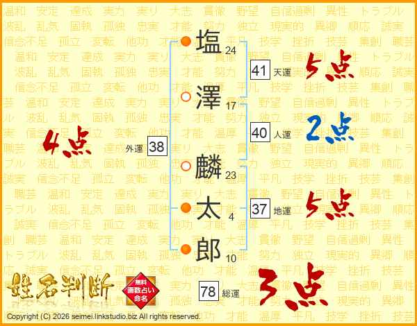 塩(24画)澤(17画) 麟(23画)太(4画)郎(10画)
