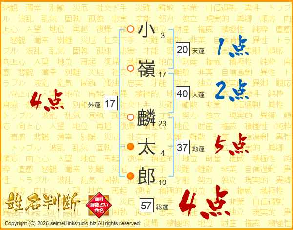 小(3画)嶺(17画) 麟(23画)太(4画)郎(10画)
