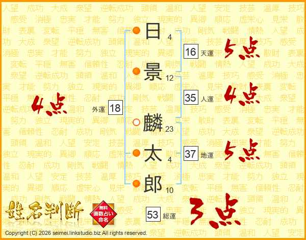 日(4画)景(12画) 麟(23画)太(4画)郎(10画)