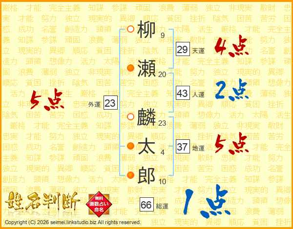 柳(9画)瀬(20画) 麟(23画)太(4画)郎(10画)