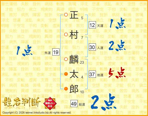 正(5画)村(7画) 麟(23画)太(4画)郎(10画)