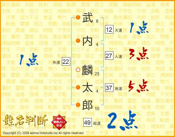武(8画)内(4画) 麟(23画)太(4画)郎(10画)