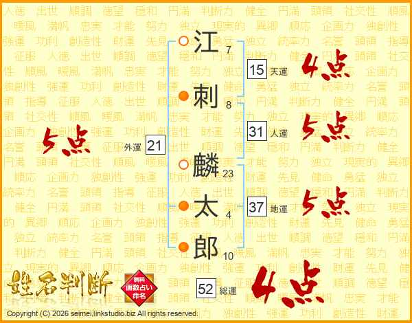 江刺麟太郎さんの総運は52画の4点!