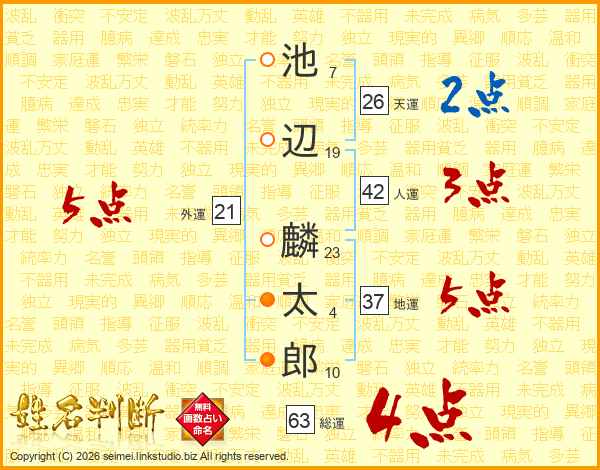 池(7画)辺(19画) 麟(23画)太(4画)郎(10画)
