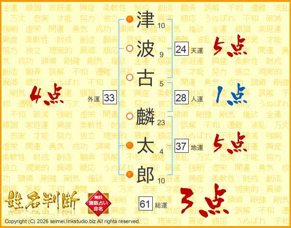 津(10画)波(9画)古(5画) 麟(23画)太(4画)郎(10画)