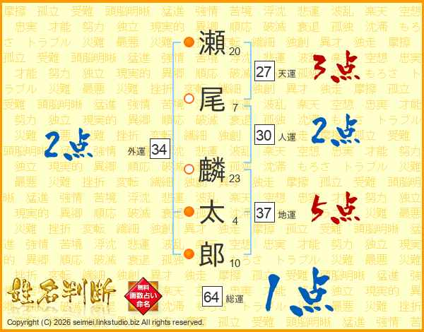 瀬(20画)尾(7画) 麟(23画)太(4画)郎(10画)
